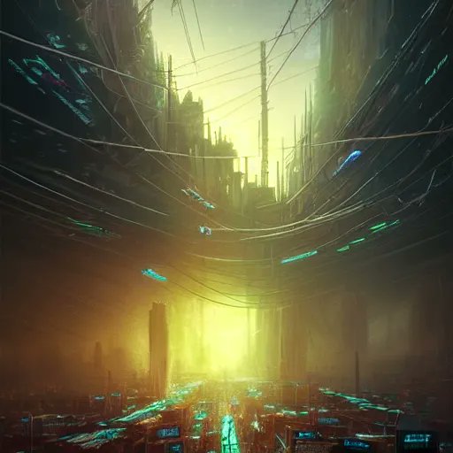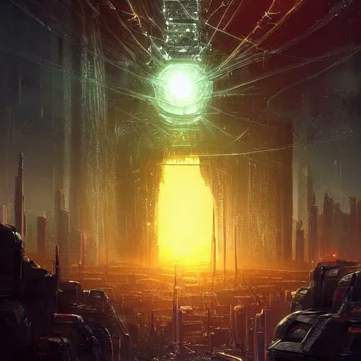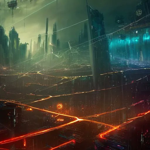 "a fleet of giant shadowy portals into the void tied to each other with lots of glowing chains in the sky" (full prompt in ALT)
