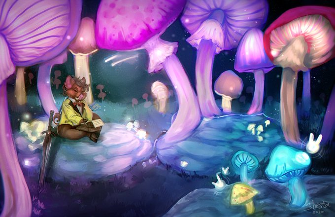 @Shroompunk I'll start! Hi I'm shesta I do commissions & have a merch shop. I'd love to have my own studio & one day create a alien-fantasy universe big enough to build a game or players-handbook from it. Short term, I want to expand my concept arting & landscape skills.