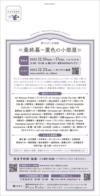 メインビジュアルを担当させて頂いたホームズ展や、美しいコラボポプリを制作して頂いた個展などの思い出深い展示の数々が生まれた場所、菫色の小部屋での最後の企画展に参加させて頂けてとても嬉しいです。