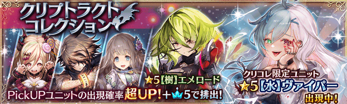 10/19(土) 14:59まで、クリコレ【第2弾】開催中!第2弾では『ヴァイパー、エメロード、ブレン、ミーミル、[火]シトルイユ』の出現率がアップ中&カリスマ5で出現!引き続き、キャンペーンガチャでは有償オーブ30個で10連&☆5ユニット1体以上確定を実施中です♪https://t.co/aLMuLHZsnt #クリプト