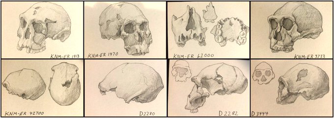 Thanks for the tags @JillGMedArt and @mesabree! #ArtistOnTwitter roll call! Here's some older artwork and a few recent sketches of early fossil crania from our own genus! #medart #sciart #illustration #anatomy #paleoart #Anthro