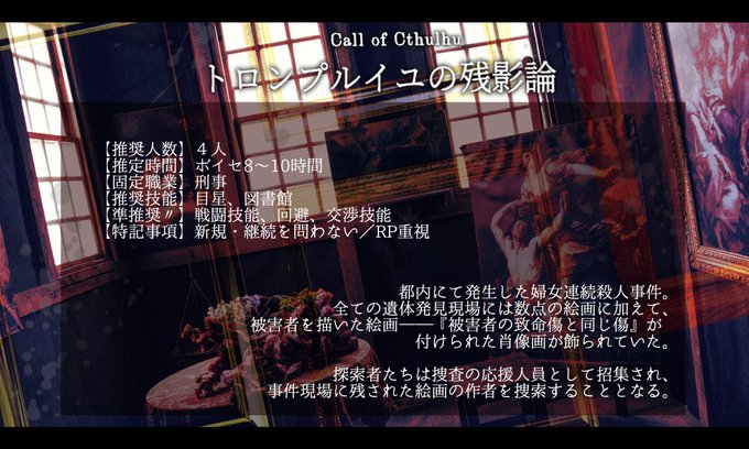 新規・継続問わず「刑事探索者」が参加可能。残された絵画、行方不明の作者——連続殺人事件の真相に挑め。