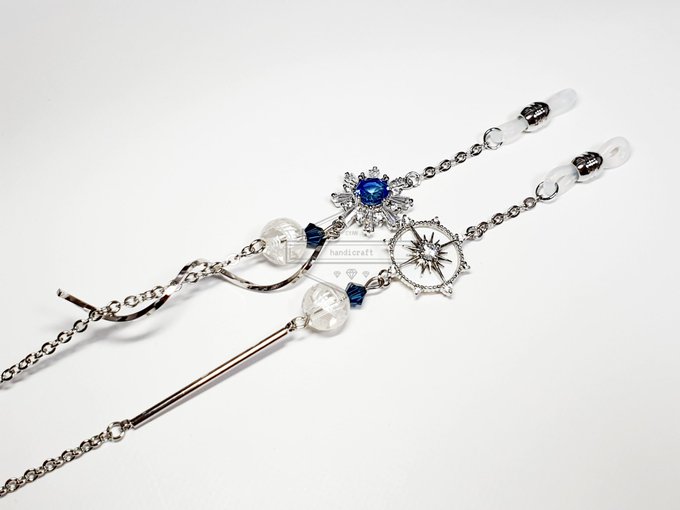 💫 게임 '페이트 그랜드 오더'의 쿠 훌린 테마로 주문받아 제작된 안경줄입니다. 원하시는 색상인 파랑이 주가 되었으며 캐릭터가 착용하고 있는 목걸이 팬던트가 초승달인 것 같아 오른쪽에만 추가해보았습니다.
