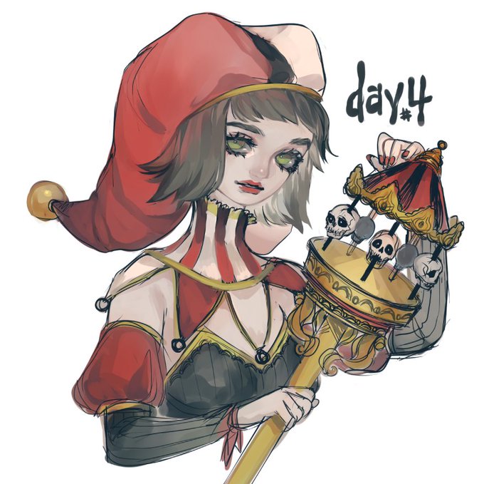 #drawtober2018 day 4: carousel curse. a jester witch who magicks souls into an eternal torment as skulls on her staff. she loves to play whimsical circus music on a loop in their minds 🎶