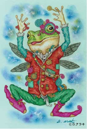 【福招きネコマタ】ンホニで軽業師をしている、しっぽがふたつある三毛猫。 お祭りの日は色々な場所から呼ばれて、大忙しである。空飛ぶ鯛に乗っている。(D.アラキの裏地球より) 《原画販売済み》