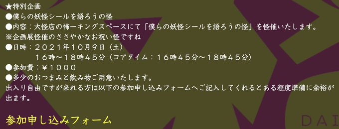 こちらも10/9に「僕らの妖怪シールを語る怪」を企画しておりますので、参加希望の方は記入お願いします!