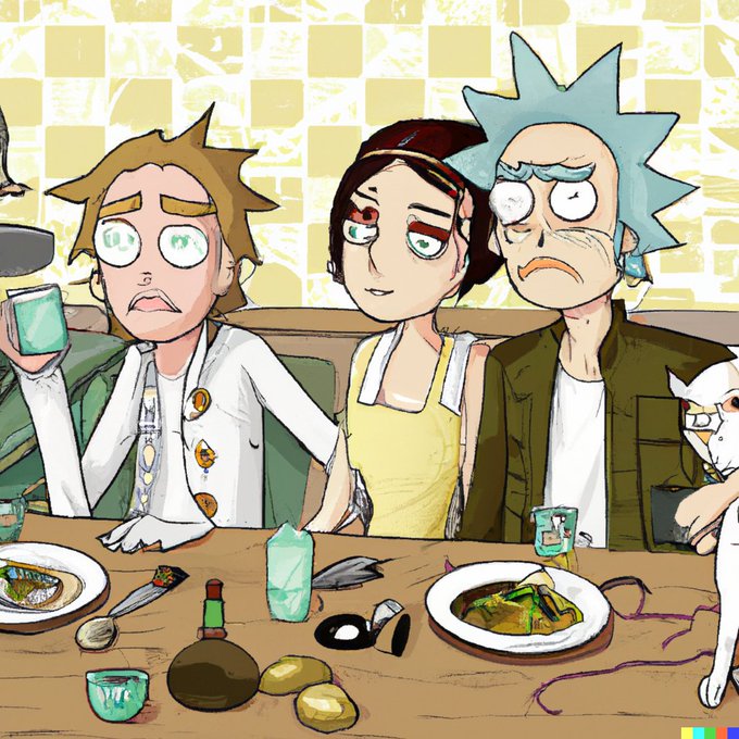 Rick and Morty having lunch with Jerry and Elaine. Everyone is immensely hung over.