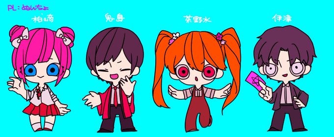 (謎)探し KPたん(@trpg_nuntyo ) 左から折目(わし)、俊くん(@seiraiA )、サンちゃん(@arisaemiri )、安芸くん(@kusacan1003 ) 描かせていただきました!