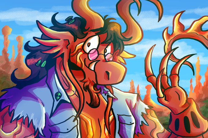 Today is Leo Oberon--a gentle himbo cowboy with alien DNA that's turned him into a lumbering, volcanic horse-monster. He likes the outdoors, playing his guitar, and arson. It's also his birthday today! 🎉
