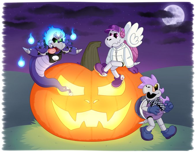 Commission for @SuperHooktailJr featuring his oc Hooktail Jr., along with @OngakuDragon's oc Klueless Koopa, and @Nepptenio's oc Skelnepp! Thanks for commissioning me and Happy Halloween! 🎃
