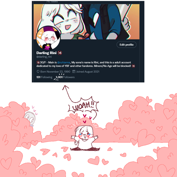 Well I got to 1k even with all the blocking TwT but WOAH I"M SO GLAD TO SEE SO MANY OTHER SIMPS TO TALK TO!! I wish I could do something nice for you all kadjlkafj for being here with me and being so gosh darn nice to me ;w; its so overwhelming pffbt I wanna do something nice!!!