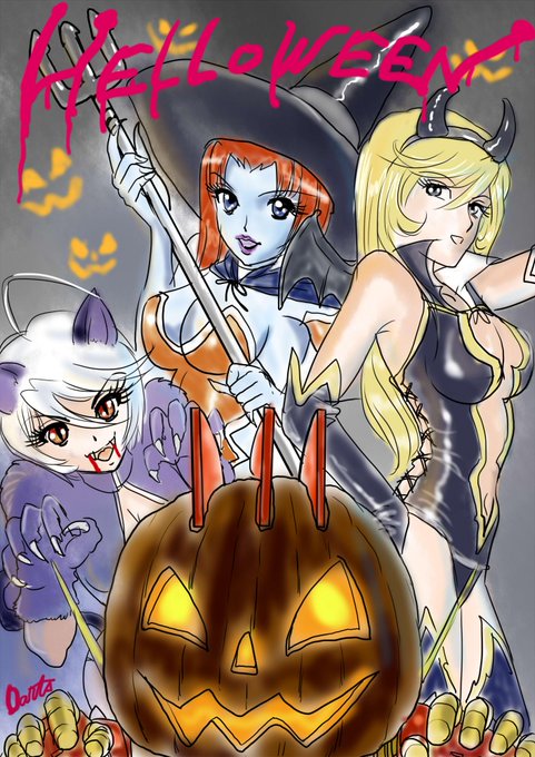 ワンドロお題「ハロウィンパーティ」。ガールトーク3人娘のハロウィンパーティへようこそ!(ハッシュタグ忘れたので再UPww) #ヤマトでお絵描き60分一本勝負 #ymt60draw