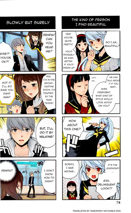 Colorizing Persona comics (4 Koma King Vol 5 Part 16, DNA Media Comics). Credit to maboroshi-no's blog (https://t.co/oyBK19mk08) for the translations and typesetting. (1/2)