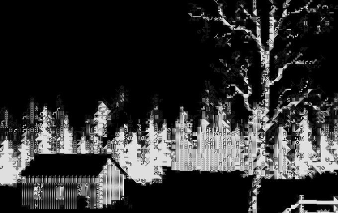 Some halloween themed creepy glitch trees and cabin using custom #petscii char set #c64