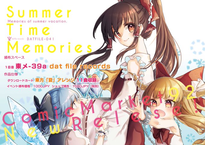 [お知らせ2]当日の頒布場所は 一日目 東地区 メ - 39a 「dat file records」となります。お誕生日席一歩手前ですが、分かりやすい位置にいますので是非お立ち寄りください。頒布物の一覧は下記のとおりです。 #c92