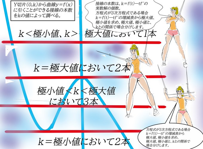 (0,k)を通る接線の本数を求める問題。接点tからY切片に導く関数f(t)を想定して、f(t)の極大値、極小値と、y=kとの関係から、接線の本数を求めます。