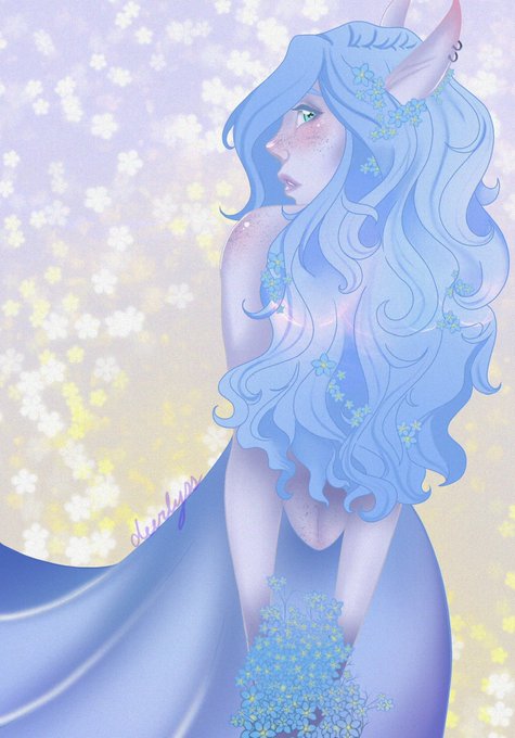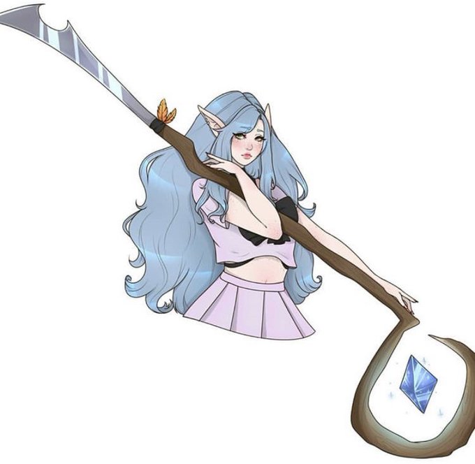 @tiri_art this is gwynevire! she’s my comfort oc that deals with her own personal “tragic backstory”. very reclusive, big doe eyes, pretty antisocial. is either constantly blushing, crying, or both. carries around a giant healing staff/glaive?? (second and third pieces not by me!!!)