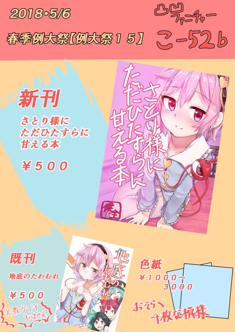 5月6日に開催される春季例大祭でさとり様の甘やかし本出します!! ドキドキしてもらえたら幸いです!! さとり様にただひたすらに甘える本 https://t.co/IxEiDUEMYu メロンブックスさんで予約開始してました!!こちらもよしなに!!