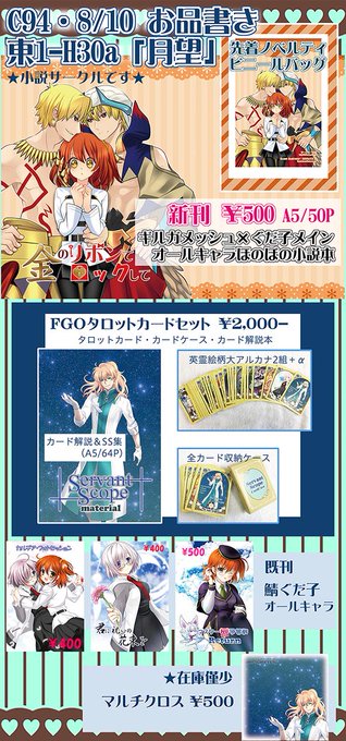 新刊はギルぐだ子中心オールキャラ本、既刊FGOタロットカードセットなど。