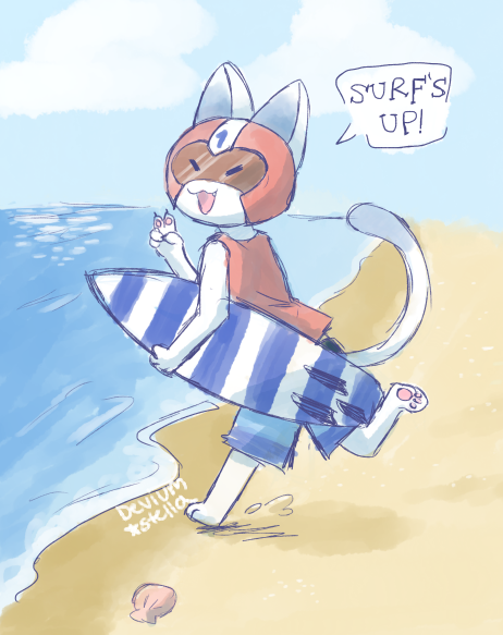 I get the feeling Kid Cat ain't afraid of water- so he runs the surf shack on my island! Then drew a Kabuki and Tia reqs for ppl in an AC discord server. My drawing muscles needed it;;; #animalcrossing #acnh #AnimalCrossingNewHorizons