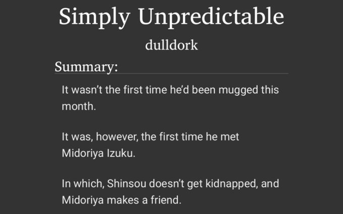 Got the wonderful opportunity to work with dulldork on their fic 'Simply Unpredictable' 💜💚 featuring a a chance meeting between pre-UA Deku and his new friend Shinsou <3 created as part of @BNHAFlashBang !