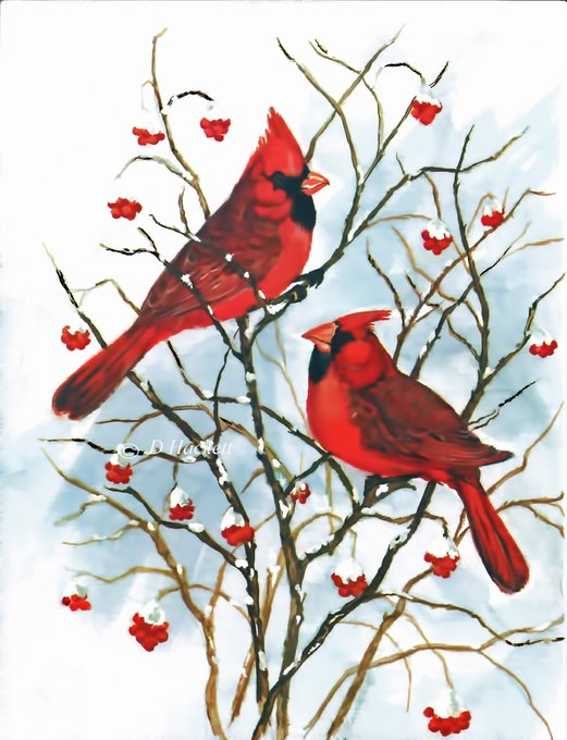 Original digital art created by D Hackett of two male #cardinals sitting on a berry filled tree branch in #winter https://t.co/wuiSHO4IaX