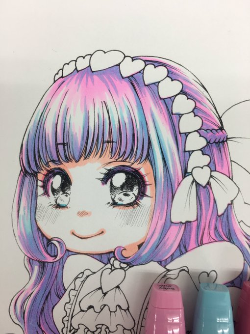 主人公の色塗りを始めました。オシャレ百均・セリアのアルコールマーカー(2本100円)で。まずは肌の影と、髪の毛と。「夢かわいい」を目指して、パステル調の薄紫と水色を乗せてます。とりあえず、こんなところかな?他の場所も塗って、あとでバランス調整します。