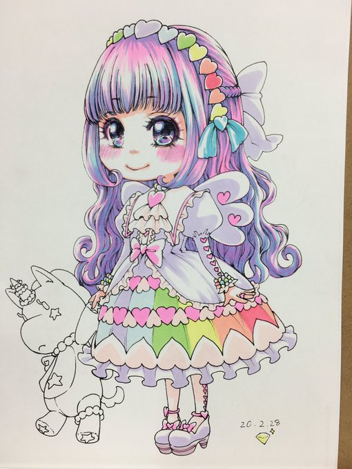 仕事終わって服の色ぬり。カチューシャと同じパステル系の虹を入れつつ、薄紫でゆめかわを演出…のつもり。塗り残しを多めにして陰影を表現してみたけど、影は影で必要かな?