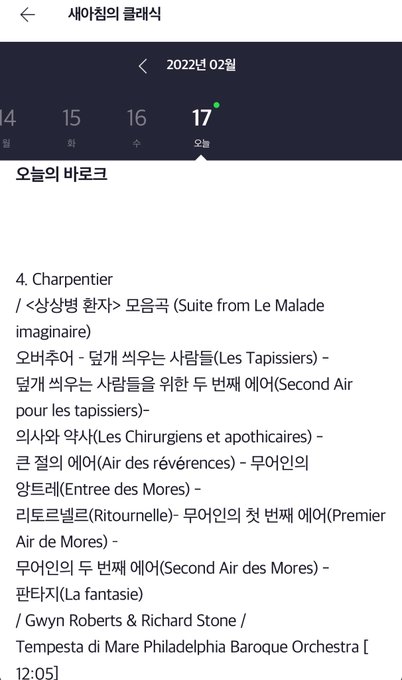 새아침의 클래식 오늘의 바로크. 오늘은 ‘상상병 환자’를 쓴 몰리에르가 세상을 뜬 날. 몰리에르는 주연도 맡아 열심히 연기했으나 상연도중 쓰러져 사망했다고. 루이14세에게 보여주려고 했는데 정작 왕은 보러 오지 않음. 왕이 잘못했네.
