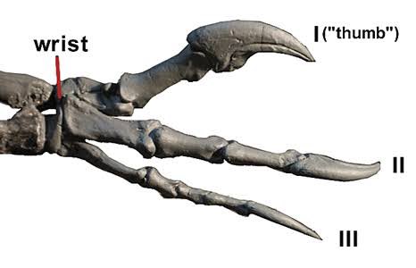 前足の解説、3本指で第一指の爪が大きい。肉食恐竜の前足は退化的で、アロサウルスもそのうちの一つ。しかし、アロは手の平がデカイ。前方向にあまり動かないので、口を使って捕まえた方がはやい。無理に使おうとすると獲物に引っ張られてひねる可能性大。