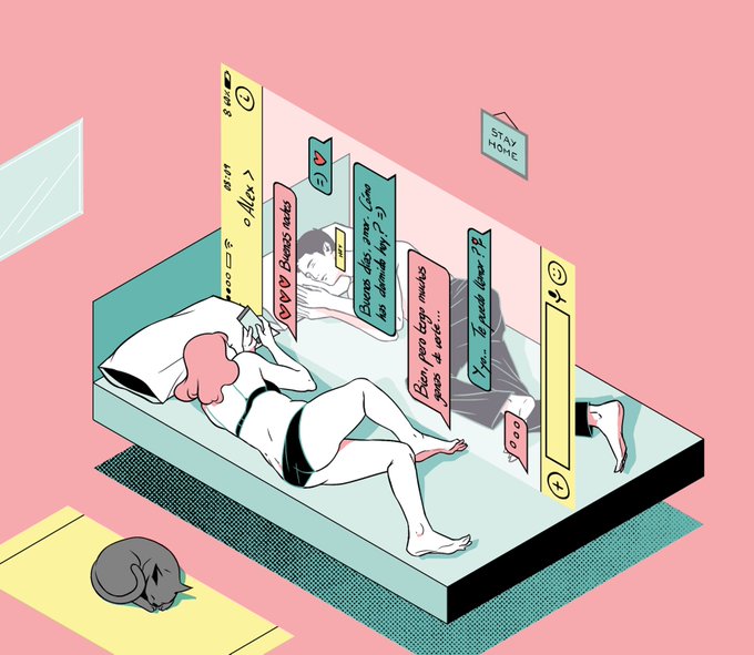 "Confined Love" 📱💕 Editorial illustration by @laurawaechter for El País Semanal, about couples confined apart due to the coronavirus crisis.