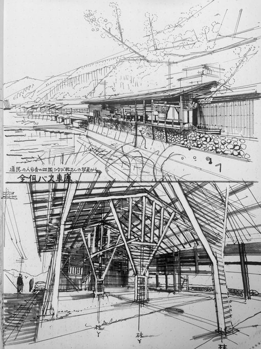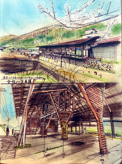 ■スケッチ 道民の人さん@North_ern2 の写真から 〝「全但バス車庫」の切り抜き看板がついた木造の古い建物。ブリキ板をしっかり切り抜いている。 兵庫県の山岳地帯、八鹿駅の近く〟 (さよなら)全但バス車庫 着彩了 https://t.co/bnthBdmiQk