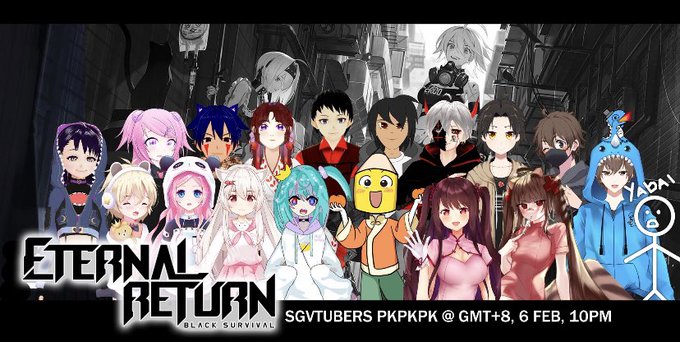 this is the biggest collab i have ever been a part of. tonight, 10pm GMT+8 watch me and 17 other sg vtubers play eternal return 🖤 p.s. i thrive in chaos