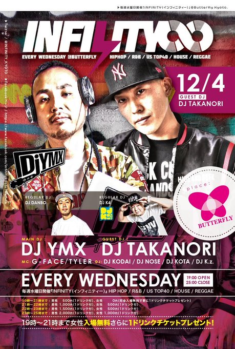 今日は@INFINITY_KYOTO guestにDJ TAKANORIさんです! 9時までに来たらかなりお得でございます!