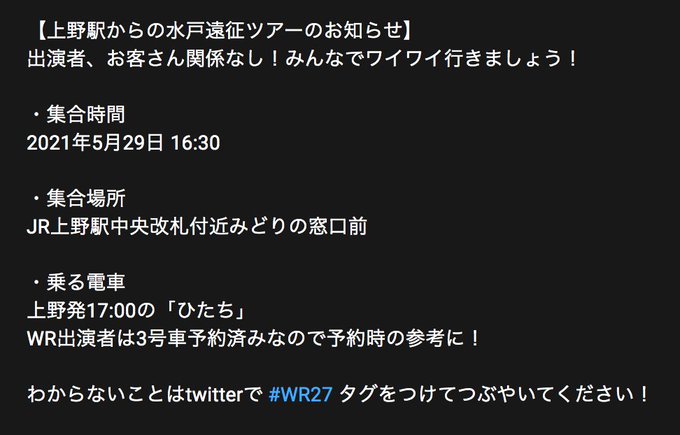 東京方面から向かうお客さん向けに上野駅からのツアーもやるよ!16:30集合!参加自由!