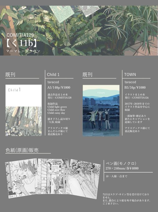 8/25(日)コミティア129のお品書きです。 スペース【く11b】マーマレードタウンにて既刊二種類と色紙を扱います。変更がある場合またお伝えします。どうぞよろしくお願いします。 #COMITIA129
