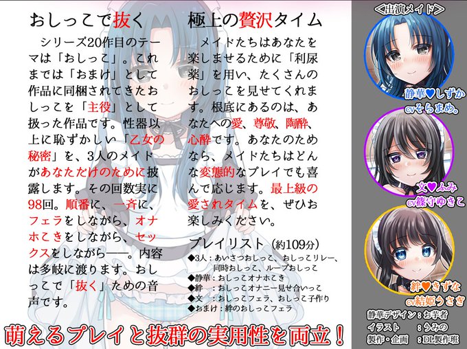 お屋敷メイドと「おしっこの日」 3人のメイドがおしっこしながらエッチなことをたくさんしてくれるハーレム音声+オナサポ付き♪/DL製作班 20%OFF 3/7まで https://t.co/l44TrCby3J