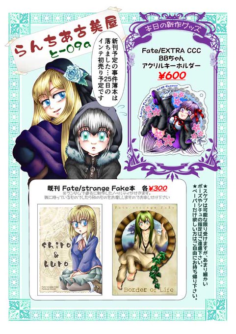 【C96お品書き】1日目 西2 と-09a『らんちあ古美屋』。新刊の事件簿本は落ちてしまいましたが新作のBBちゃんアクキーを作りましたのでよろしくお願いします(ミスがあったので再うp)
