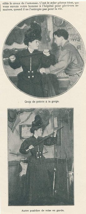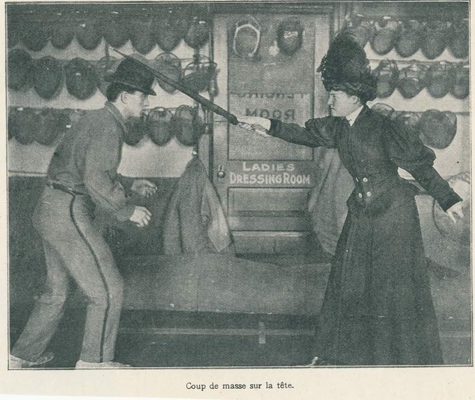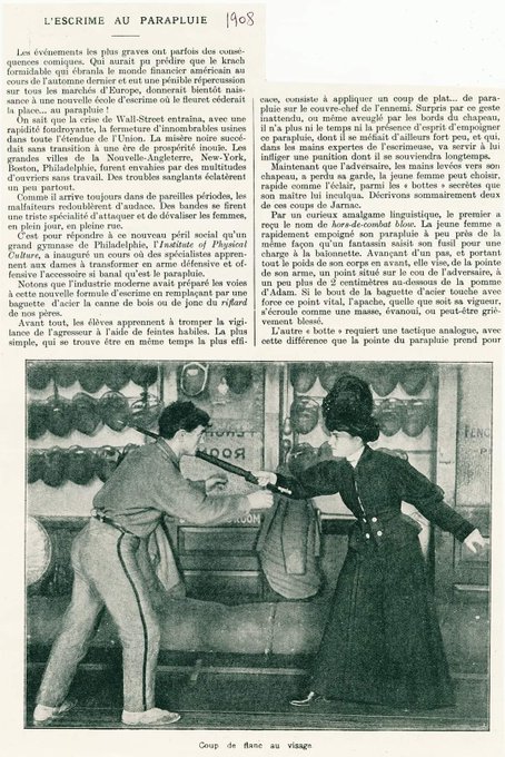 Cocasse extrait d'un journal de Philadelphia qui publie, en 1908 et en français, un article sur la défense au parapluie. Avec une femme en démonstratrice.