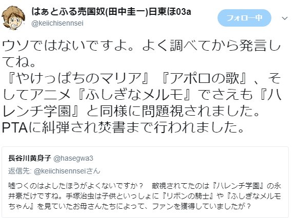 手塚作品敬愛しすぎてそっくりのタッチで本が作れて手塚るみ子さんとこういう掛け合いまでしてる手塚知識の塊な田中圭一先生に向かって「嘘つくな」と上から目線でまたも恥を晒した長谷川黄身子氏。プロの格闘家に喧嘩売って一撃で顎パン気絶くらったチンピラ感ある