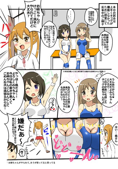 お品書き(ただいま製作中)幼馴染(青)と後輩(赤)が先輩をめぐってプロレスで向いあってのにらみ合いの図と早苗さんのリンコス。