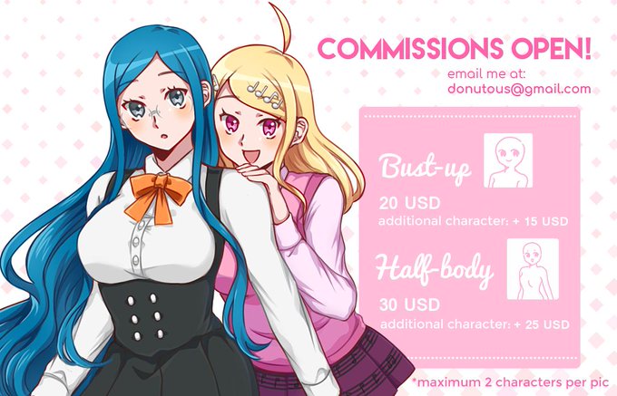 Hellooo im opening commissions due to a school requirement, I'll be taking 2 slots only!! if interested please email me at donutous@gmail.com or dm me here!