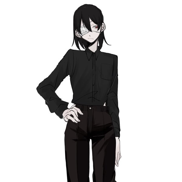 前髪が迷子なんだよね とりあえず黒髪 あと眼帯が...つく......... 見た目の攻撃力高くしたいのでコートの裏に武器とか入れたいし勲章みたいなのじゃらじゃらつけたいよ お前に描けるのか?