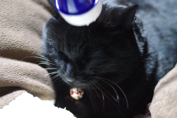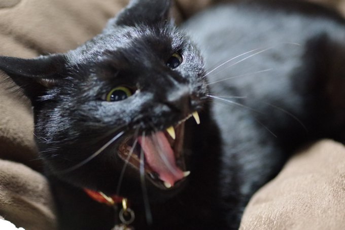 ダイソーの肩叩きでマッサージされているうちに気持ちよくなって大あくびをする黒猫さん。