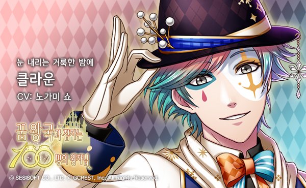 [왕자소개] 클라운 (CV : 노가미 쇼) - 광대의 나라 카르나바라의 왕자. 자신의 본심을 드러내지 않으며 익살맞게 행동하는 것이 특기. 상대가 누구든지 일단 웃기려고 한다. 순회 공연 중 방문한 다텐에서 마술쇼를 하던 중 폭설을 만났다. #꿈왕국