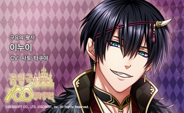 [왕자소개] 이누이(CV : 사토 타쿠야) - 달력의 나라 구요의 왕자. 술의 일족. 머리가 좋은 책략가이며 지배욕이 강하다. 몸과 마음 모두 압도적으로 강하다. 야심가이며 타인에게 결코 약점을 보이지 않는 면도 있다. 여성을 보면 바로 손을 대며 그 매력으로 반드시 자기 것으로 만든다. #꿈왕국