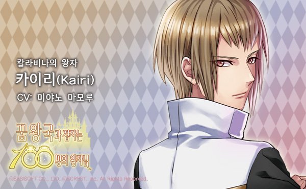[왕자소개] 카이리(CV : 미야노 마모루) - 망국 칼라비나의 왕자. 사람 사귀는 것을 싫어하여 늘 혼자 행동한다. 저격수로 용병 생활을 하며 여러 마을을 돌아다니고 있다. 나라가 멸망할 때 가족을 모두 잃었다. #꿈왕국