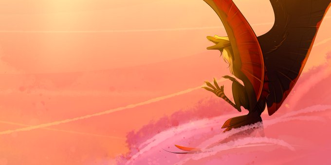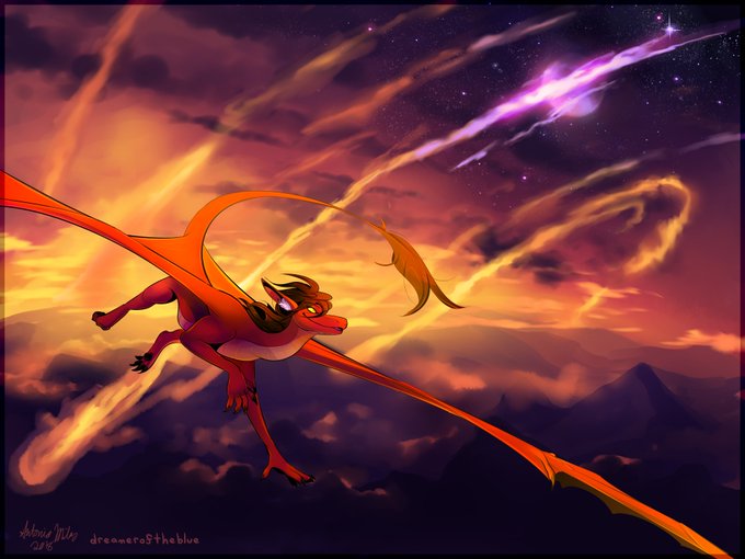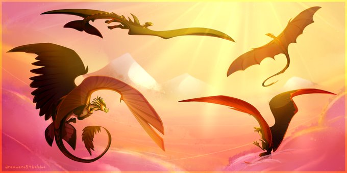 huuugeeeeee finished piece for rowhammer on FA, of his dragons flying together over the evening clouds, with the tops of mountains poking through~
