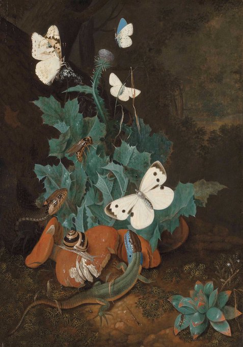 Johann Falch (? 1687-1727), A forest floor with a lizard, a snake and a snail among weeds, Oil on panel