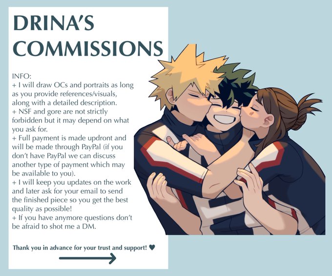 Here’s all the info you’ll need! I’m not strictly a BNHA artist so you can ask me to draw any character of any series :)